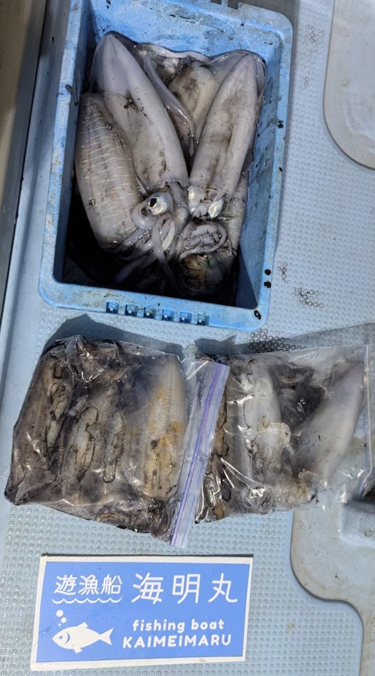 - ナイトアオリイカでの出船でした。夕時合は1杯だけで、ライトオンでしばらくしましたらポツリポツリ当り出して全員安打😊見えてるアオリイカも何杯かは上手く釣っていただいて。竿頭は9杯ほどで、皆さん墨だらけでした~😊<div>今日はお疲れ様でした。またの乗船お待ちしております。<br><div><br></div></div>