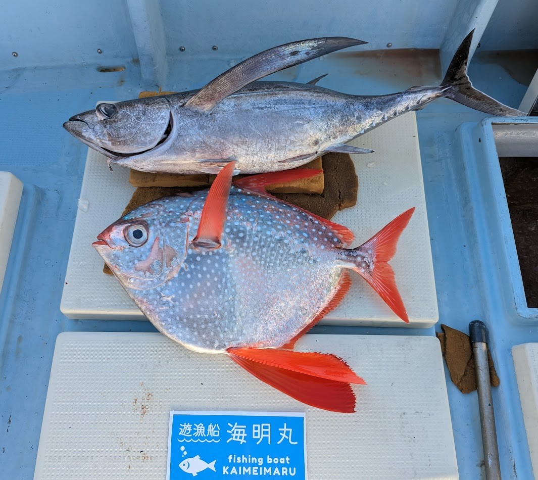 - トンジギ便での出船でした。なかなか当たりがない中、ダブルヒット😊ライン同士絡んで大変でしたが、一人の方の魚が上がってきたらまさかのアカマンボウ・・・もう一人の方はしばらく格闘しましたがフックアウトで残念・・・おそらくアカマンボウだと思います。次の流しでは小さい当たりがあり合わせたら・ドン・ときまして皆さん見守る中、上がってきたのは中トンでした😊初トンボおめでとうございます!その後はあまり船が流れない感じで何もなく終了でした。<div>今シーズン初トンジギでしたが、何とか姿は見れたので良かったです。</div><div>今日はお疲れ様でした。またの乗船お待ちしております。</div>