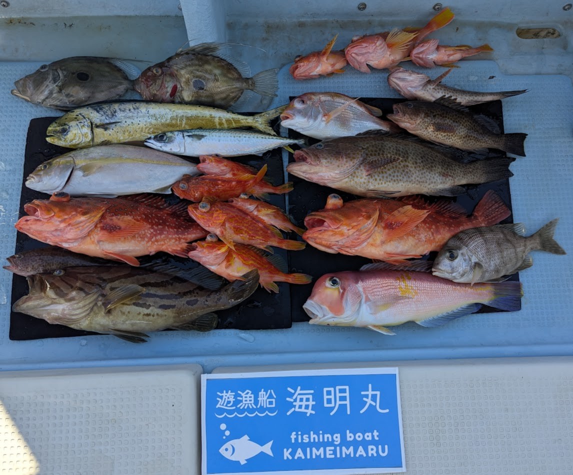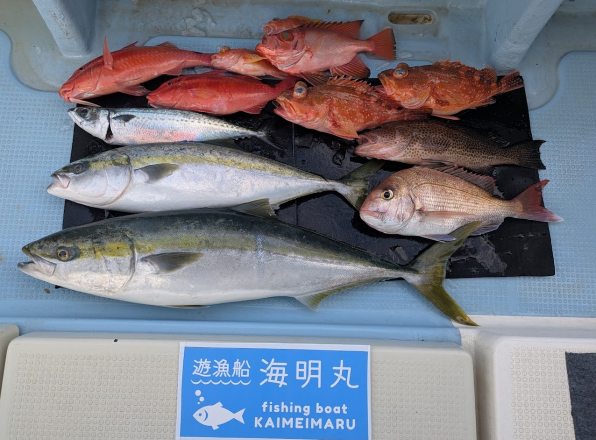 - オリジナルコースでライトジギング、タイラバ、他での出船でした。朝一は深場からスタート・・・一投目からワラサ😊<div>今日はいい感じと思いましたが後がイマイチ・・・少し浅場のポイントでダブルヒット・・・いい引きで釣れたのはブリ😊続いて食べごろサイズのマダイ・・・後半は少し浅場のポイントでティップラン、ジグで挑戦していただきましたが、アオリイカは配当なし・・・ジグはオオモンハタ、アカハタ、オジサンなどポツリポツリ釣れてましたが食べる分だけキープしてあとはリリースありがとうございます。魚種はブリ、ワラサ、マダイ、チカメキントキ、オオモンハタ、ウッカリカサゴ、オジサン、アヤメカサゴ、ゴマサバなどでした。</div><div>今日はお疲れ様でした。またの乗船お待ちしております。</div>