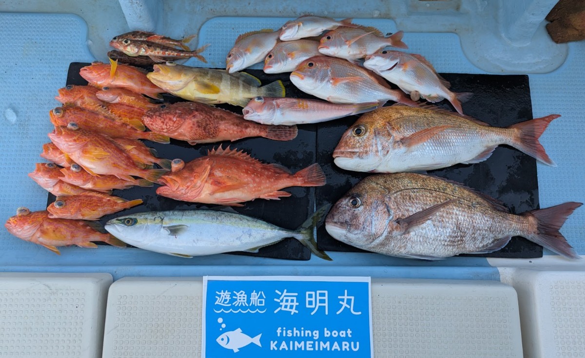 - ライトジギング、タイラバ便での出船でした。朝からウネリのある中、深場中心に挑戦していただきました。<div>朝一ワラサから根魚中心にぽつぽつで終盤にまたワラサ、マダイなどキャッチで最後まで頑張って頂きました。</div><div>魚種はワラサ、マダイ、レンコダイ、マトウダイ、ホウキハタ、ウッカリカサゴ、アヤメカサゴなどでした。</div><div>今日はお疲れ様でした。またの乗船お待ちしております。</div>