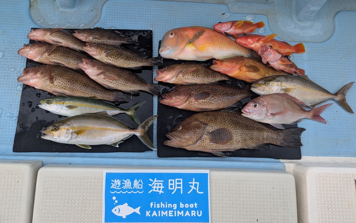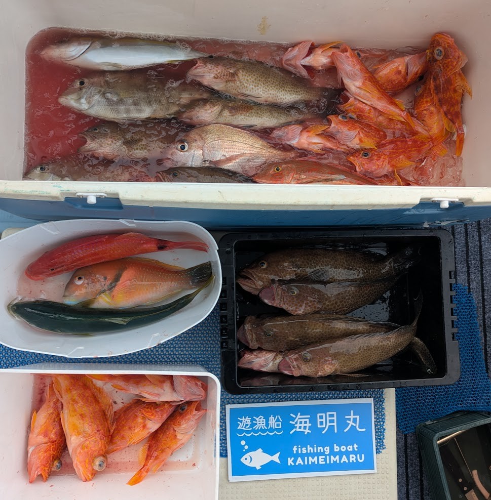 - タイラバ、一つテンヤ、SLJでの出船でした。前半は少し風もあり船がいい感じで流れて皆さんぽつぽつ釣れてイイ感じ😊小学生お子さんがいきなりナイスサイズのホウキハタキャッチ😊タイラバ初挑戦のご夫婦hマダイ、メイチダイ、ツバス、など色々な魚種を釣っていただきました後半は船があまり流れないでイマイチな感じで終了でした。😊あと、フックアウト多数で残念でした😢魚種はマダイ、メイチダイ、キツネダイ、オオモンハタ、アカハタ、アオハタ、ホウキハタ、ホウボウ、オジサン、ウッカリカサゴ、アヤメカサゴ、イラ、イトヒキアジ、ツバス、シオなどでした。<div>今日はお疲れ様でした。またの乗船お待ちしております。</div>